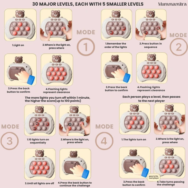 🎮 Pop & Play – Flashing lights and 4 game modes for nonstop fun.